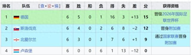 最终,本组德国队直通美加墨,斯洛伐克进入附加赛,小组第3北爱尔兰凭借欧国联成绩同样进入附加赛。