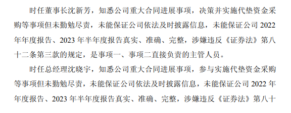 时任董事长沈新芳被给予警告并罚款350万元;时任总经理沈晓宇被给予警告并罚款170万元;时任财务总监杨云被给予警告并罚款100万元;时任财务总监钟伟琴被给予警告并罚款100万元;时任董事会秘书翁鑫怡被给予警告并罚款90万元;时任副总经理、董事会秘书罗斌斌被给予警告并罚款60万元;