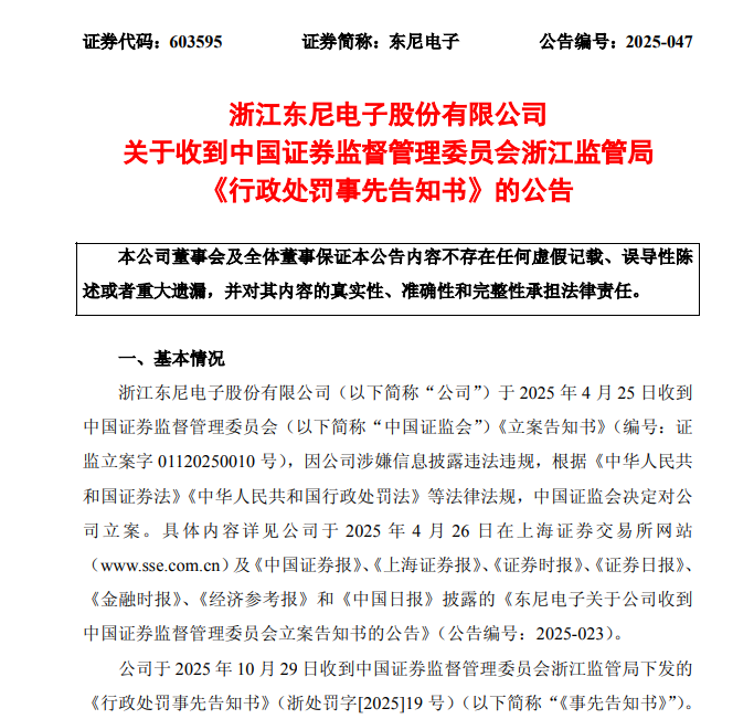 10月30日,东尼电子(ST东尼(603595),603595.SH)公告称,公司于2025年10月29日收到中国证券监督管理委员会浙江证监局下发的《行政处罚事先告知书》(以下简称“《告知书》”)。