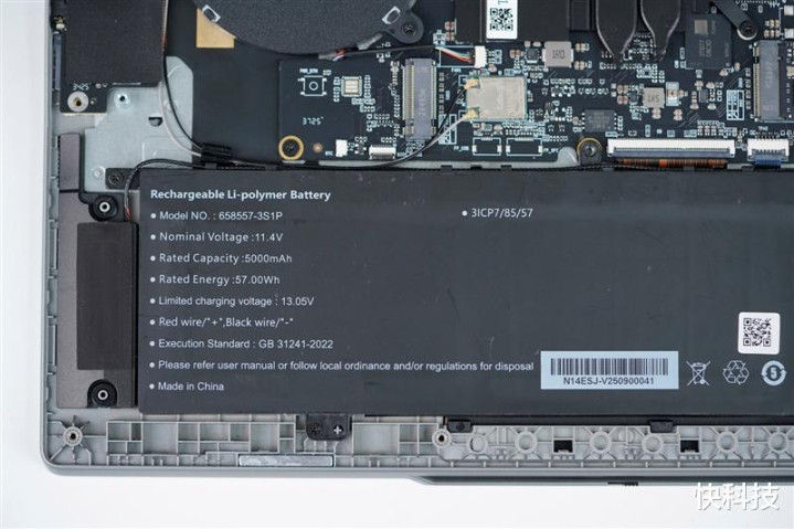 奥睿科Obook超能本搭载的57Wh电池,电池旁边是扬声器音腔。