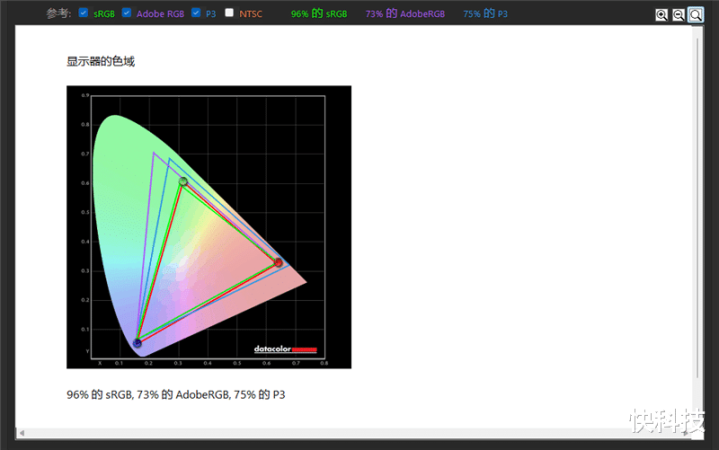 我们使用蜘蛛SpyderX Elite校色仪对奥睿科Obook超能本的屏幕进行测试,可以看到奥睿科Obook超能本所搭载的14寸柔光屏,色域三角覆盖了96%的sRGB色彩空间。