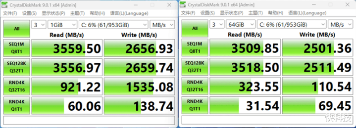 奥睿科Obook超能本自带的奥睿科J-10 1TB SSD,在CrystalDiskMark测试中,连续读写速度分别达到了3559MB/s和2656MB/s,4K读写速度也能达到60MB/s和138MB/s。
