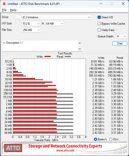 在ATTO Disk Benchmark测试中,奥睿科J-10 1TB SSD的0.5K小文件读写速度达到了33.8MB/s和63.9MB/s,从16K时开始读写速度都超过了1GB/s,从256K开始速度基本达到最大,写入超过2.4 GB/s,读取超过3.3 GB/s。