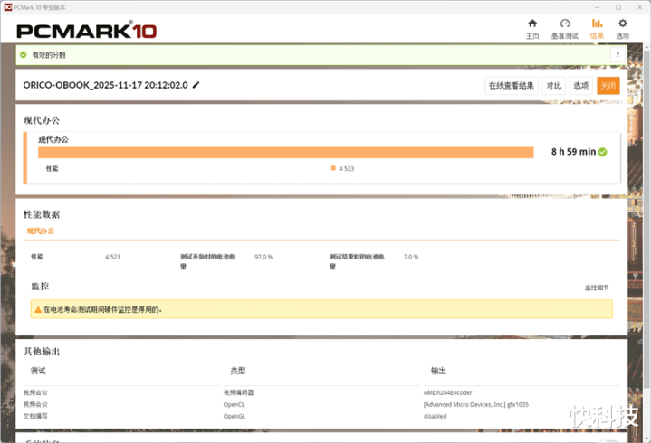 最后我们使用PCMark10对奥睿科Obook超能本进行续航测试,期间屏幕亮度保持50%,从电量97%时开始测试,到电量剩余7%时测试自动结束,共用时8小时59分钟,电量消耗了90%。
