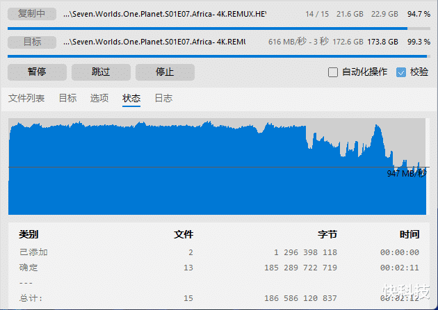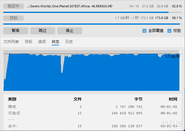 之后的校验过程,可以看到几乎全程保持1.7GB/s的读取速度,只用1分50秒就完成173GB文件的校验。