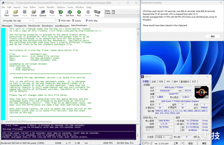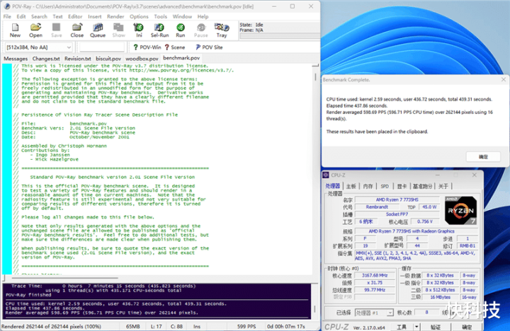 在PVO-Ray基准测试中,多线程成绩为4561.17pps,单线程成绩为598.69pps。