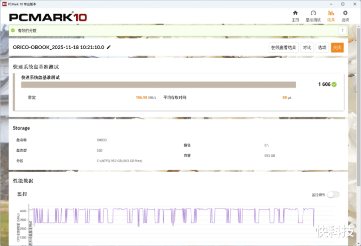 在PCMark10的快速系统盘基准测试中,奥睿科Obook超能本的得分为1606。
