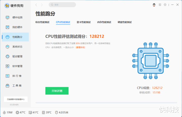 在硬件狗狗的CPU性能评估测试中得分为128212,超过了全国95%的笔记本用户。