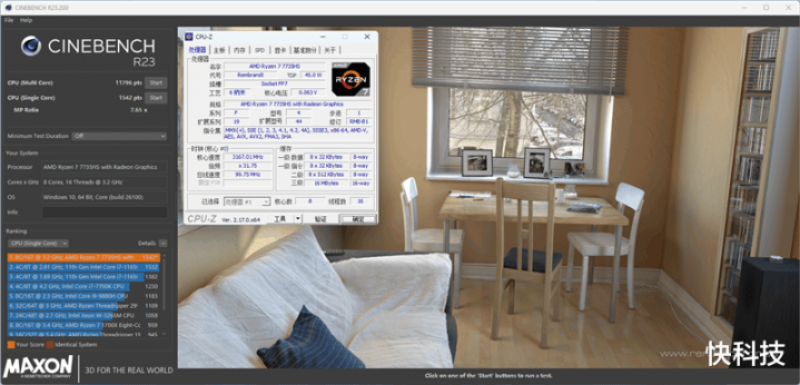 在CineBench R23测试中,AMD锐龙7 7735HS处理器的多核成绩为11796pts,单核成绩为1542pts。