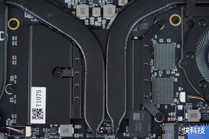 中间CPU上贴有两根加宽热管,将热量导向两侧风扇散热。