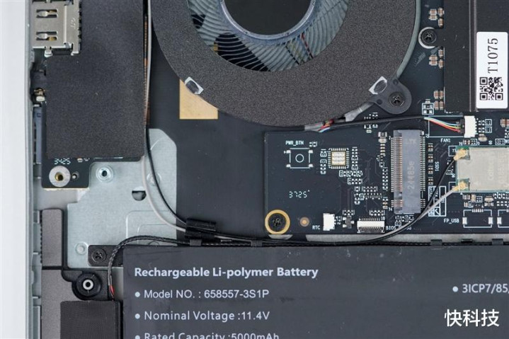 卸下底部11颗螺丝之后,就可以打开底盖看到笔记本内部结构。