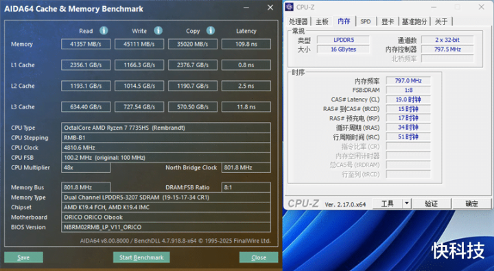 奥睿科Obook超能本在AIDA64的内存测试中,读取、写入和拷贝的速度分别为41257、45111和35020,延迟为109.8ns。