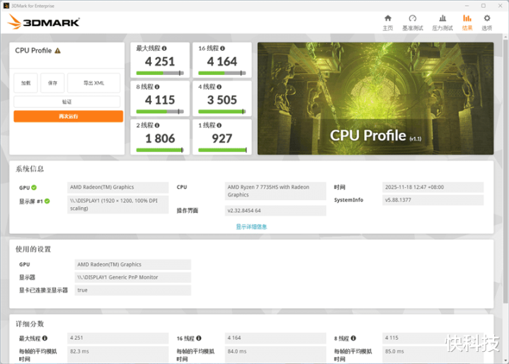 在3Dmark的CPU基准测试中,奥睿科Obook超能本的单线程成绩为927,最大线程成绩为4251。