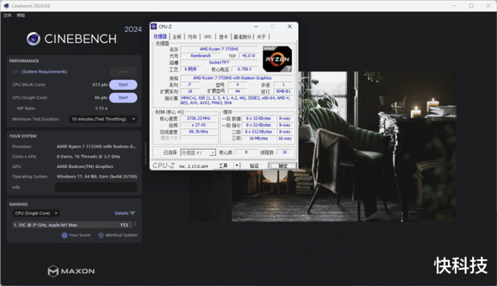 在CineBench 2024测试中,AMD锐龙7 7735HS处理器的多核成绩为613pts,单核成绩为86pts。