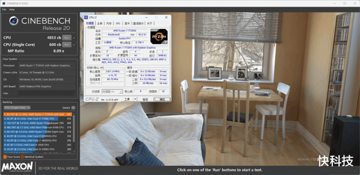 在CineBench R20测试中,AMD锐龙7 7735HS处理器的多核成绩为4853cb,单核成绩为600cb。