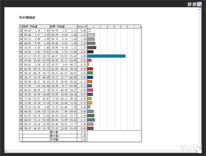 色彩精度方面也非常优秀,平均Delta-E仅有1.03,除了1F色彩偏差较大之外,其余色彩精度都极为优秀,最低Delta-E甚至只有0.25,整体素质不输专业显示器。